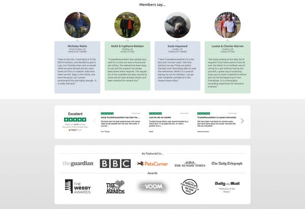 Trusted Housesitters展示了目前服务的知名企业标识与获得的奖项。