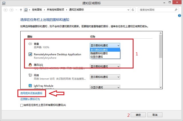 打开通知区域图标窗口,将“音量”设置为“显示图标和通知”,点击“确定”即可显示音量图标。如果设置完都不显示,接下来在左下角,找到“启用或关闭系统图标”(如图2所示),