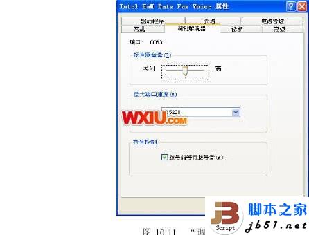 (7)在该选项卡中的“扬声器音量”选项组中,用户可调节扬声器的音量;在“最大端口速度”选项组中,用户可在其下拉列表中选择调制解调器的最大端口速度;在“拨号控制”选项组中,用户可选择在拨号时是否等待扬声器发出拨号声音。