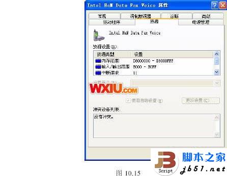 (15)在该选项卡中,用户可在“资源设置”列表框中查看资源的类型及设置信息;在“冲突设备列表”列表框中,显示了存在冲突的设备的列表。 (16)选择“电源管理”选项卡,如图10.16 所示。