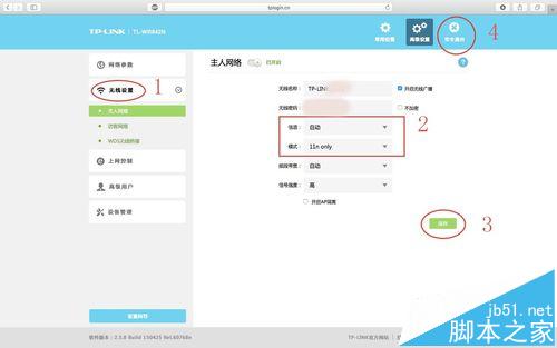 3、点击左侧“无线设置”,将右侧的“模式”改成“11n only”,点击“保存”,最后点击右上角的“安全退出”。