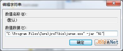 6、在注册表编辑器中,找到“HKEY_CLASSES_ROOT\Applications\javaw.exe\shell\open\command”,在其中文件打开命令中加入参数“-jar”(无引号),修改后的数值类似:“"C:\Program Files\Java\jre7\bin\javaw.exe" -jar "%1"”(只需要添加-jar参数,无需修改其他信息),保存并退出注册表编辑器。