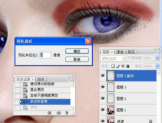 9。多边形工具建立眼角交接处的选区,羽化。建立一空白图层,填充前景色。