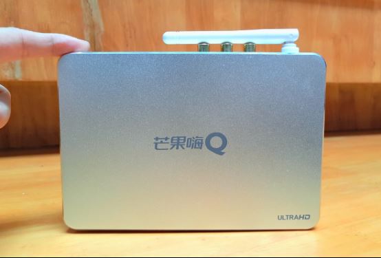海美迪Q5四代机身方方正正,四角做了圆润处理,泛着银色金属光泽。正面印有“芒果嗨Q”的LOGO,背后有一根白色塑料天线。作为一款定位4K的电视盒子,对网络要求也比较高。