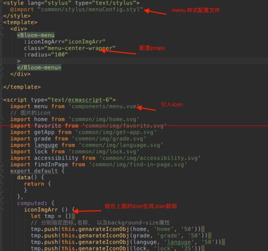 import您需要的icon,然后生成iconImgArr(computed属性绑定),作为props传给menu组件