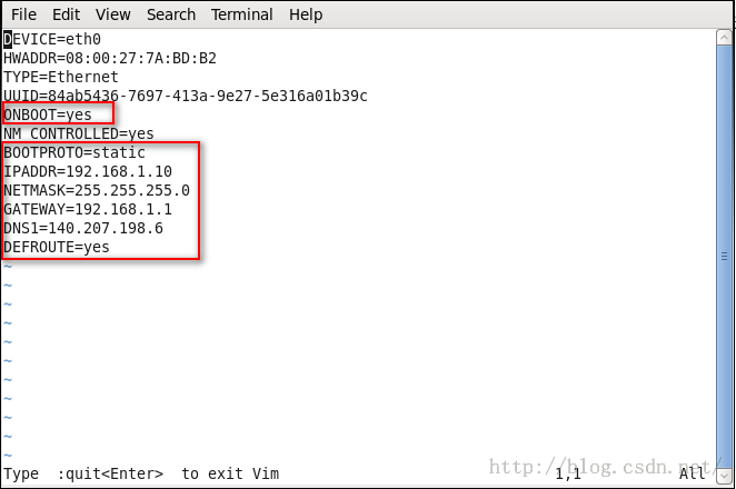 输入命令:vim /etc/sysconfig/network-scripts/ifcfg-eth0