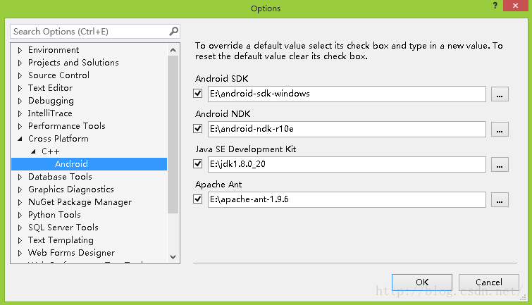 除了Android SDK的手动安装步骤略繁(必备包括Android SDK Tools, Platform-tools和Build-tools等), 其它基本都是一个zip直接解压就行了. 最后需要在VS2015->Tools->Options->Cross Platform配置下地址, 具体看图:
