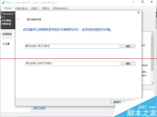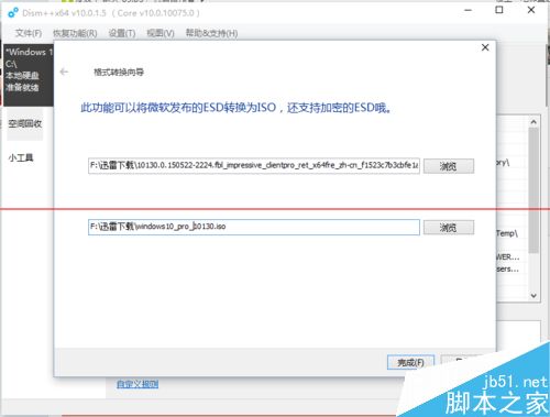 3、在弹出的“格式转换向导”对话框里找到你下载好的windows10推送系统esd镜像,并指定好转换的ISO格式文件名和保存的位置。点击“完成”按钮