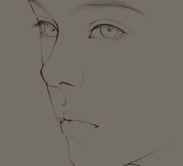 5、好了。正式开动,把原图开出来,描轮廓线。我喜欢从鼻子开始,一般来说,转折强烈的地方线条重一点,轮廓柔和的地方轻一点带过去。鼻子这个眉宫到鼻梁那边、鼻尖处,都是转折强的位置,描到这里时候压粗一点。尽量让线条在贴合轮廓的基础上,有粗细起伏的变化。