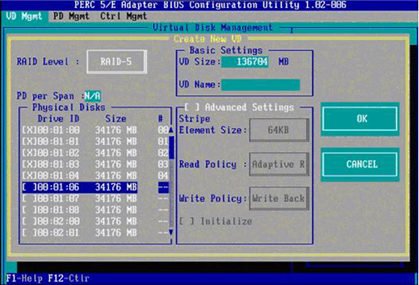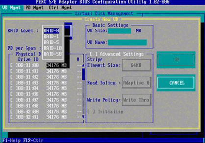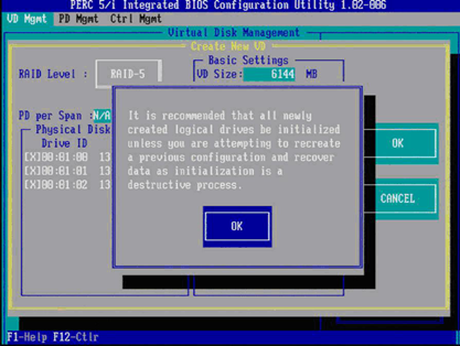 注:由于虚拟磁盘的建立是基于刚才所创建的阵列,所以RAID Level与刚才所创建的相同,无法更改。