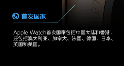 据悉,Apple Watch 将于4月10日起接受预购,4月24日起正式发售,首发包括中国在内的9个国家和地区(中国大陆、中国香港、澳大利亚、加拿大、法国、德国、日本、英国、美国)。这次首发包含中国大陆地区。