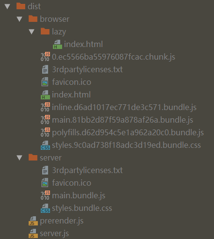 因此,从dist目录可以看到,服务端预渲染会根据配置好的路由在 browser 生成对应的静态index.html。如 / 对应 /index.html,/lazy 对应 /lazy/index.html。