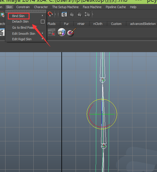 11、选择根骨骼按下shift键在加选台灯,在菜单里找到skin菜单里的bind skin选项,如图所示;