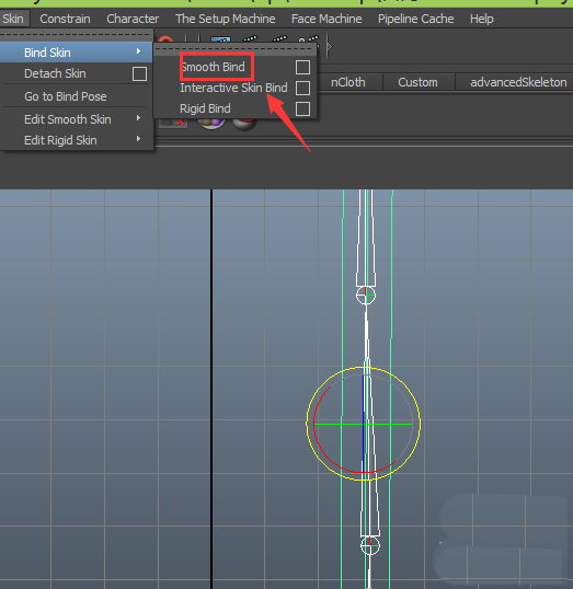 12、点击bind skin选项,在其下拉菜单里找到smooth bind选项,点击smooth bind选项我们就给台灯进行了蒙皮操作,如图所示:
