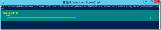 用命令行:convert-VHD –path d:\Hyper-v\vhd\server2003sp2.vhd –destinationPath d:\Hyper-v\vhdx\newwin.vhdx
