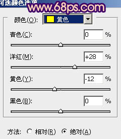 1、打开原图素材,创建可选颜色调整图层,对黄、绿、黑进行调整,参数设置如图1 - 3,效果如图4。这一步把背景主色转为黄褐色。