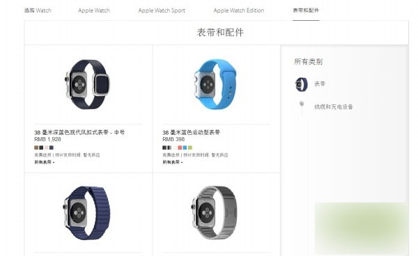 苹果官方也提供了8种额外的表带,除了金属表带外,都可以提供多种颜色选择,价格从398-3588元不等。而官方的磁力充电线价格则为238元(1米)和298元(2米)。
