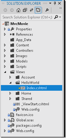 您可以在解决方案资源管理器中看到MvcMovie\HelloWorld文件夹和已被创建的MvcMovie\View\HelloWorld\Index.cshtml文件: