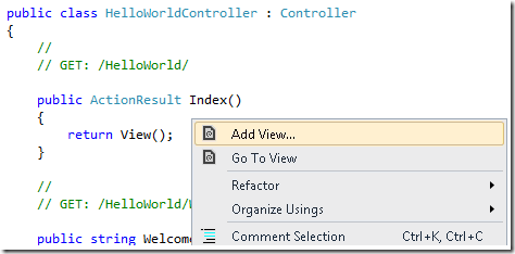 在该项目中,您可以使用的Index方法来添加一个视图模板。要做到这一点,在Index方法中单击鼠标右键,然后单击“ 添加视图“。