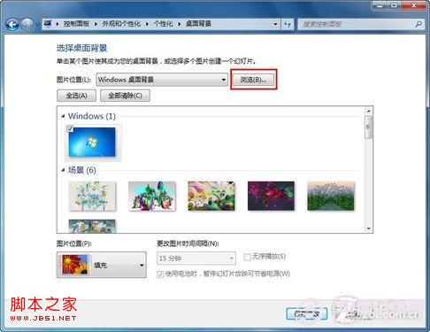 这里已经有很多Win7自带的精美主题包,第一栏“我的主题”中列出的是我们下载安装或自定义的主题包。不管你现在使用的是什么主题,点击个性化窗口底部的“桌面背景”,切换到选择桌面背景窗口,点击图片位置右侧的“浏览”,选择你存放靓照的文件夹。