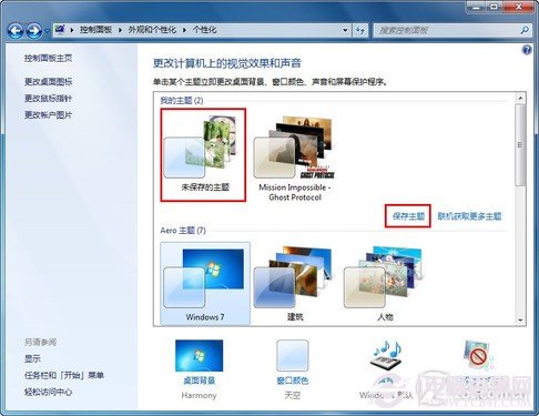 点击右侧的“保存主题”,给主题起个名字,然后点击“保存”按钮,这个只属于你的个性Win7主题就制作完成啦!