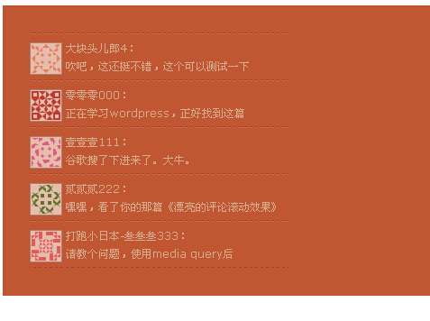 .r_comments ul li{padding:5px 0px; line-height:20px; border-bottom:1px dashed #8C391C; border-top:1px dashed #D08364;}