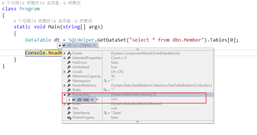 这里需要获取DataTable的主键信息,调试时发现没有主键信息,而实际数据库中是有主键(Id)