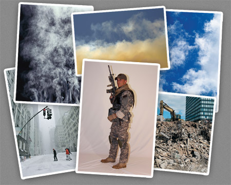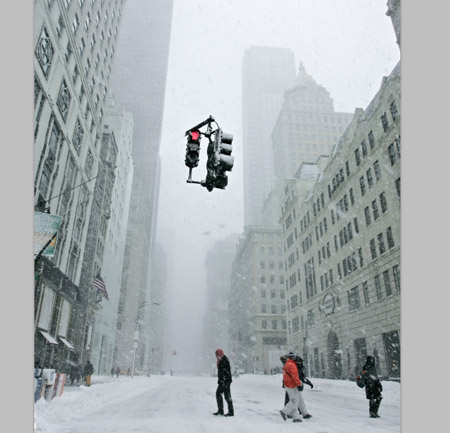 海报的主要背景是一条曼哈顿街区。下面这张雪景很适合我们要做的冷色调效果,而且图上的雾和雪花可用来制作冒烟的废墟。另外,需要用橡皮擦工具去掉图片上的交通灯。
