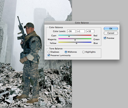这个战士上的光效不符合整体色调,打开色彩平衡窗口(Ctrl+B),分别调节阴影、中间调和高光。增大青色和蓝色值可以改变图片色调。