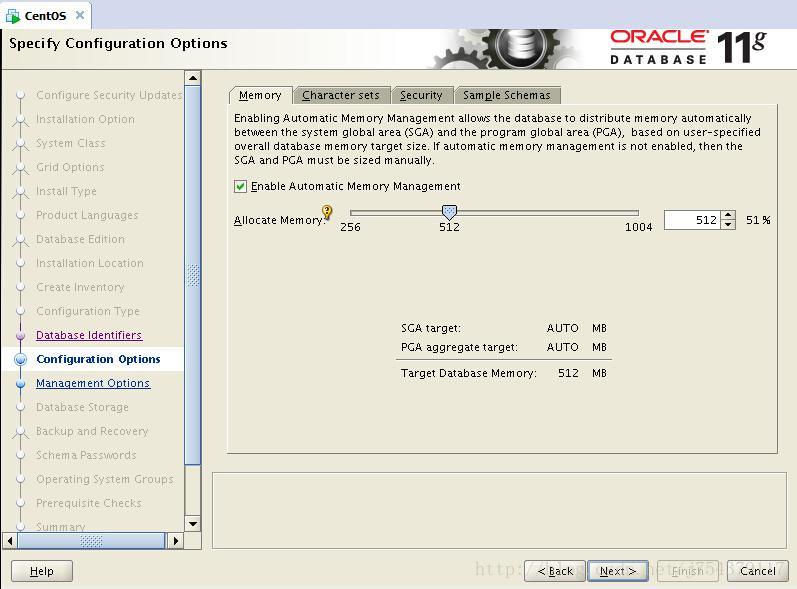12.开启自动内存管理(如果512m太大,会出现提示,减少一些就可以),然后先不要点击next,而是点击Memory旁边的Charactorsets选项。