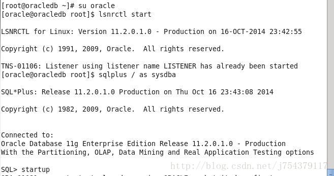 [root@oracledb~]#su–oracle [oracle@oracledb~]#lsnrctlstart [oracle@oracledb~]#sqlplus/assysdba