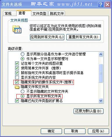 我们比较常用的方法是:我的电脑--→工具--→文件夹选项--→查看,将“显示系统文件夹的内容”前打勾,“隐藏受保护的操作系统文件(推荐)”前的勾去掉,“隐藏文件和文件夹”项选择“显示所有文件和文件夹”如下图: