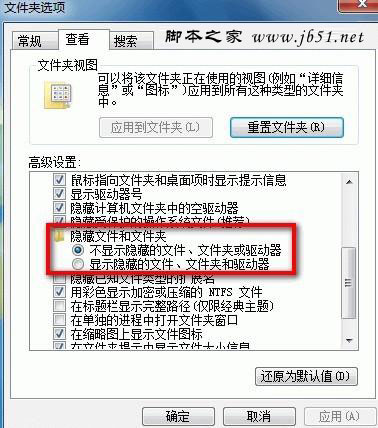 进入 文件夹选项进入的操作其实就和上面windows xp系统中的操作一样了,下面简单再介绍下:文件夹选项-查看-隐藏文件和文件夹---将不显示隐藏文件、文件夹或驱动器修改为-显示隐藏文件、文件夹或驱动器,确定即可。