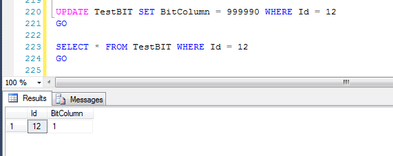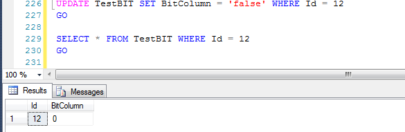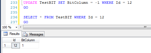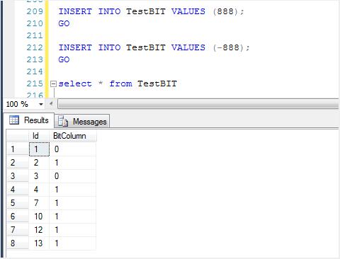 CREATE TABLE TestBIT ( Id INT IDENTITY(1,1), BitColumn BIT )