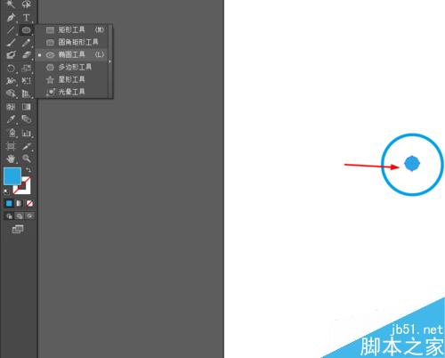3、然后选择椭圆工具,在中间画一个正圆的图形,填充蓝色,如图所示