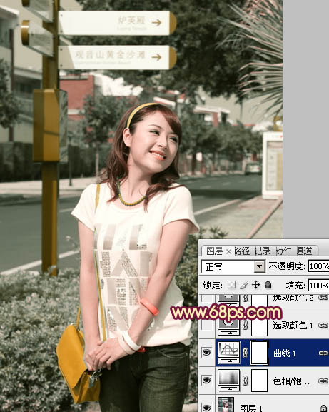 2、创建色相/饱和度调整图层,对青色进行调整,参数设置如图2,效果如图3。这一步把图片中的青色转为暗黄色。
