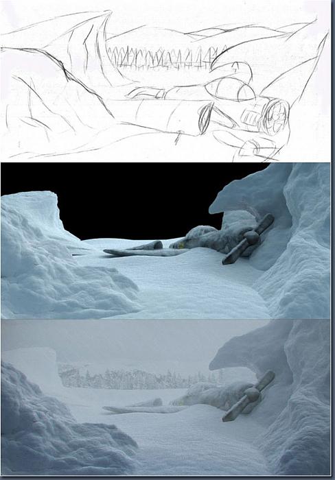 很长一段时间我希望创作一个拥有复杂冰块与积雪的场景,但是对于这个想法来说我有很大的困难也是事实,我将永远看不到积雪了。在看过电影以后我绘制了一个场景的草图,并且以草图的定义,我制作了简单的模型来用于引导工作的进行。(插图1)