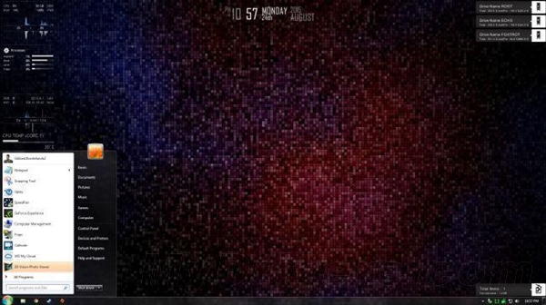 Windows 7的开始菜单在功能性上和之前的版本大体相同,但其界面风格变成了和系统匹配的毛玻璃效果。此外,原来的电源和锁定按钮如今被替换称了更加简洁的电源菜单。