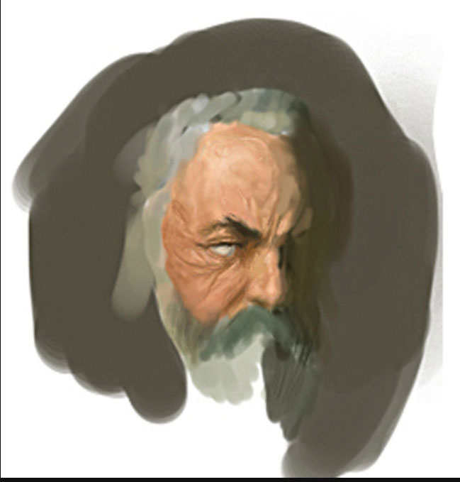 我想让这幅画看起来像是在帆布上画的感觉,我还想让它看起来严肃一些,更符合角色所处的奇幻世界。这类的世界里,巫师和斗士,都有着古代的装束。这幅里,我不是从草图开始的,而是先画了一个老人的脸。最初的想法是看起来像塔牌里的隐士那样的形象,不过不是拿着灯笼,而是别的什么武器来照亮他的道路,不过,为了让他的形象更鲜明,我很快又改变了我的想法。我不是很清楚,要画一个什么样的角色,只是画着,不停的尝试从各种形状里得到我最终的灵感。