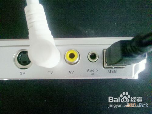 9、我们用到是“TV”和“USB”两个孔。将有线电视的线的一端插入有线的接口,另一段插入“TV”插孔,随带的USB线的对应一端插入“USB”插孔。