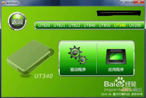 3、点击窗口中的“USB系列”,然后会出来关于型号的选择项,选择“UT340”,会看到驱动程序和应用程序,如下图所示: