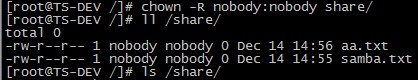 由于要设置匿名用户可以下载或上传共享文件,所以要给/share目录授权为nobody权限。