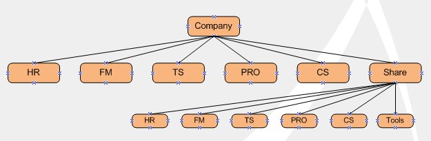 1. 在系统分区时单独分一个Company的区,在该区下有以下几个文件夹:HR、 FM、TS、PRO、CS和Share。在Share下又有以下几个文件夹:HR、FM、TS、PRO、CS和Tools。