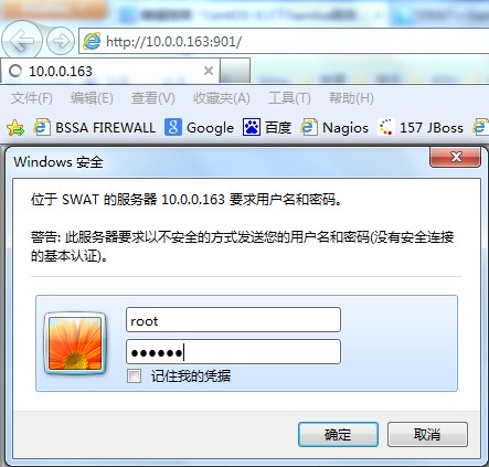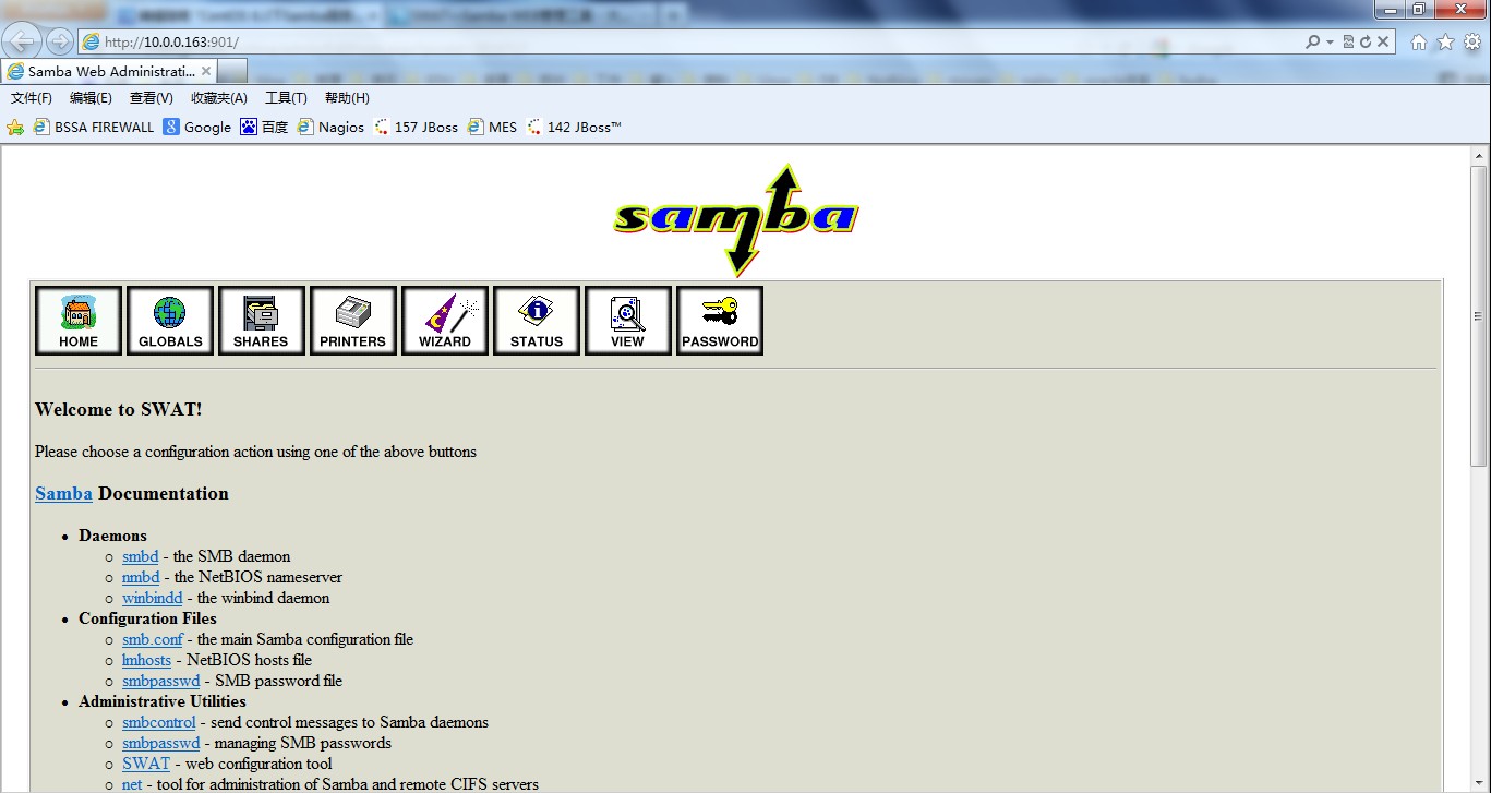 在服务端启动 swat后,我们就可以通过 swat允许范围内的客户机的浏览器中,通过 http://服务器的内网IP:901 来访问服务端的 swat了,输入 root用户的用户名及密码进入 swat的管理首页,如下所示: