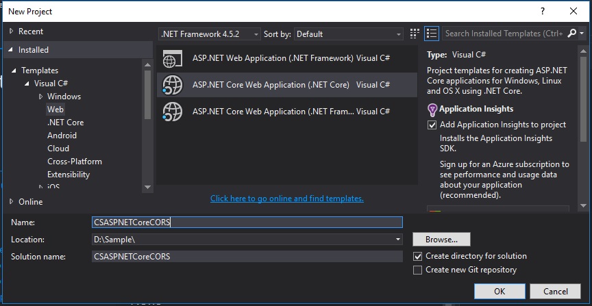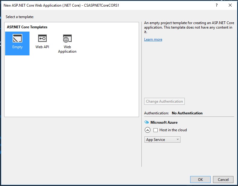 在VS中新建项目,项目类型选择ASP.NET Core Web Application(.NET Core),输入项目名称为:CSASPNETCoreCORS,Template选择Empty.