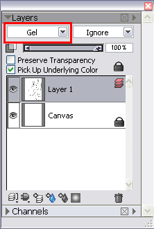 2.CTRL+A全选,按住CTRL键点击画面,把线稿单独发送为新图层,并把混合模式改为GEL。这个模式可以隐藏所有白色的像素。