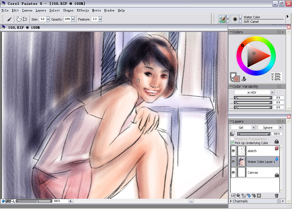 painter 8提供的water color笔刷能够真实模仿传统水彩的晕化,渗透,水迹。虽然塑造起来有些吃力,相对于其他笔刷作画的难度更大,不过为了得到独特的效果,还是值得尝试的。