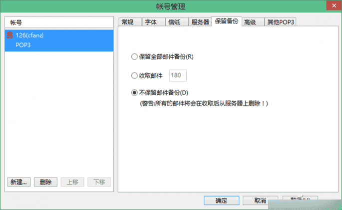 如果使用的是Foxmail 7.0,则需要在“账号管理”窗口的“服务器”页面中设置自动收取邮件的时间,并在“保留备份”页面中设置“不保留邮件备份”(图2)