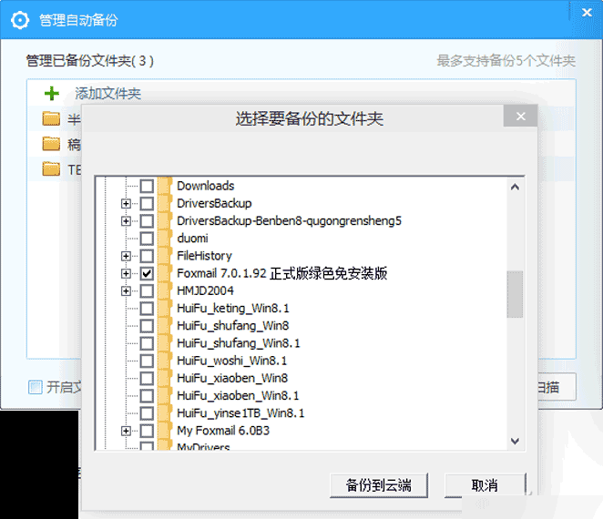 如果使用360云盘,则需要安装360云盘标准客户端(非同步版客户端)。点击“功能大全”后选择“自动备份”,将Foxmail文件夹添加到自动备份列表中即可。