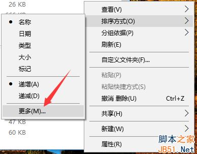 2、在空白处右键,将鼠标放到“排列方式”上,在扩展选项中点击“更多”。